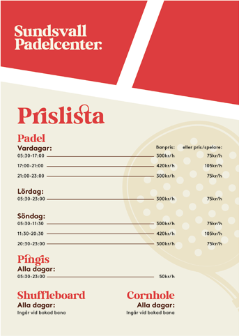 Sundsvalls Padelcenter är inte bara en padelhall – det är en plats där du kan träffa folk, svettas, ha roligt och, ja, ibland få en rejäl utmaning. Vi har 11 banor av yppersta klass som funkar för alla nivåer, från rookien till dig som lever och andas padel. Dessutom har vi en massa annat skoj som du kan roa dig med om du inte vill spela padel. Kom loss från vardagen för en stund – vi lovar, det blir kul!